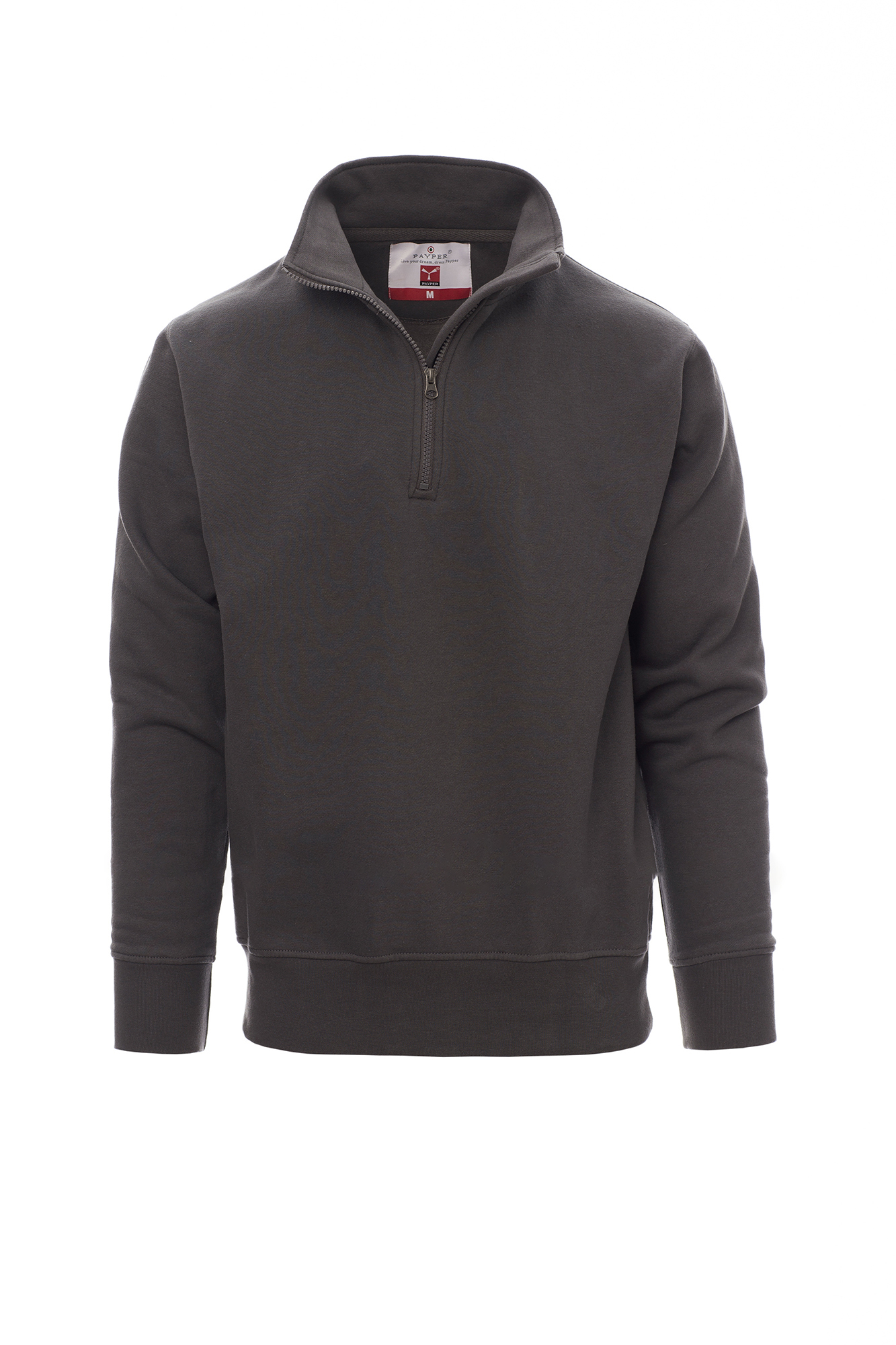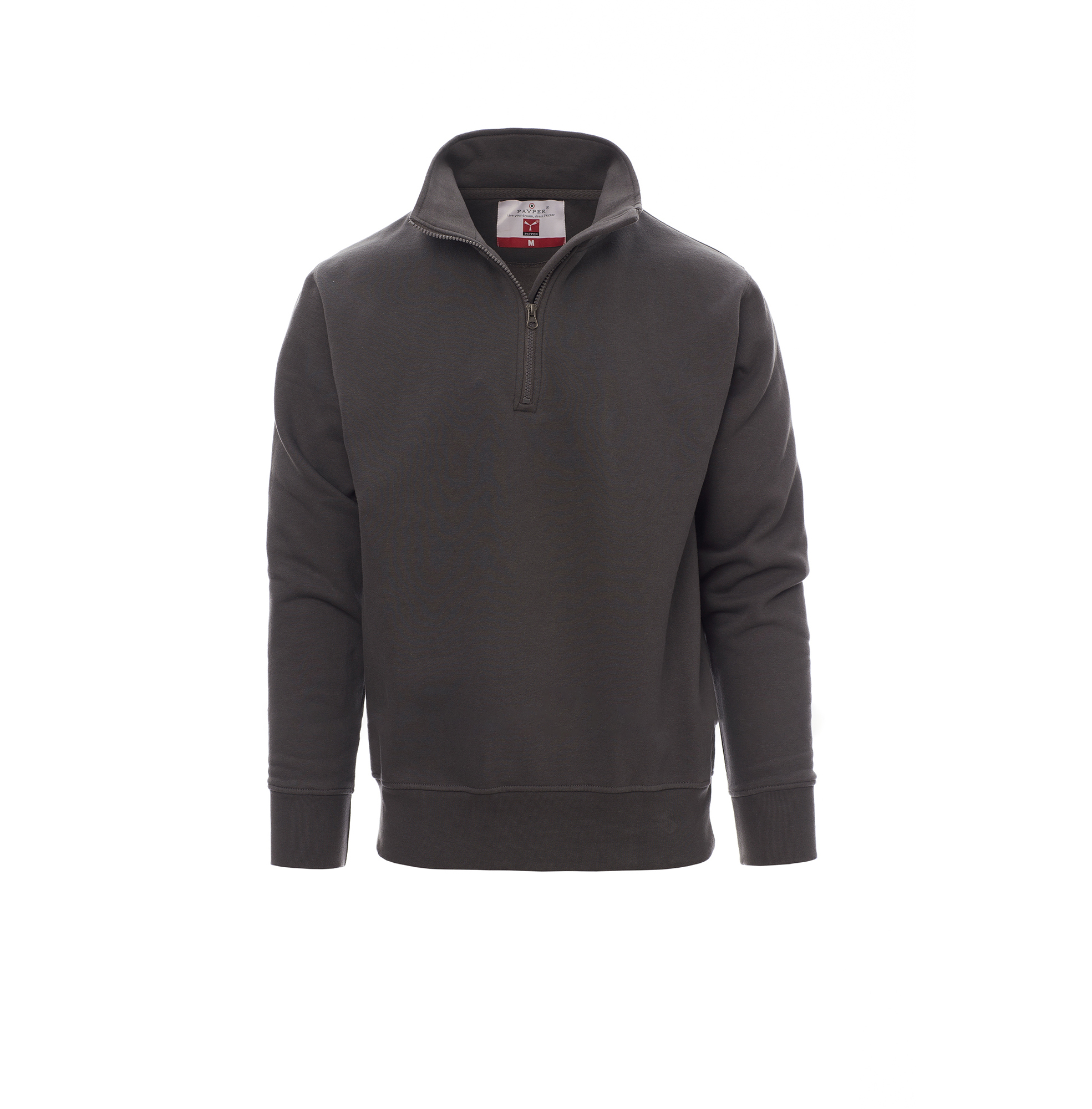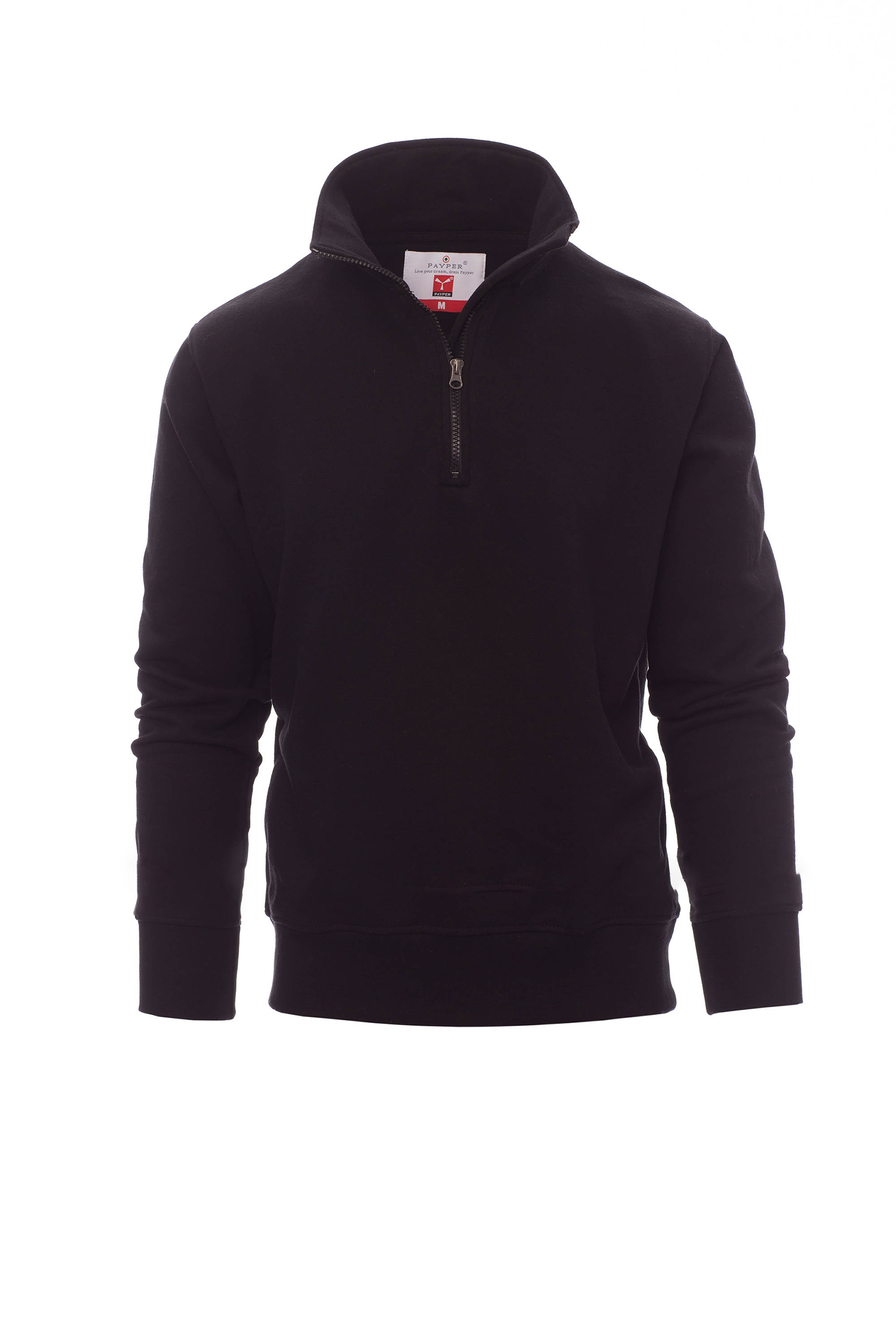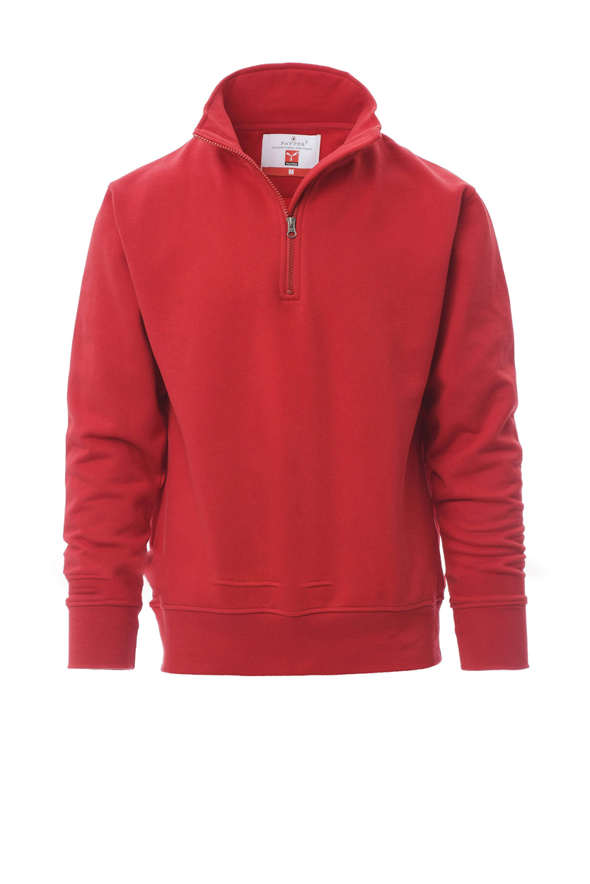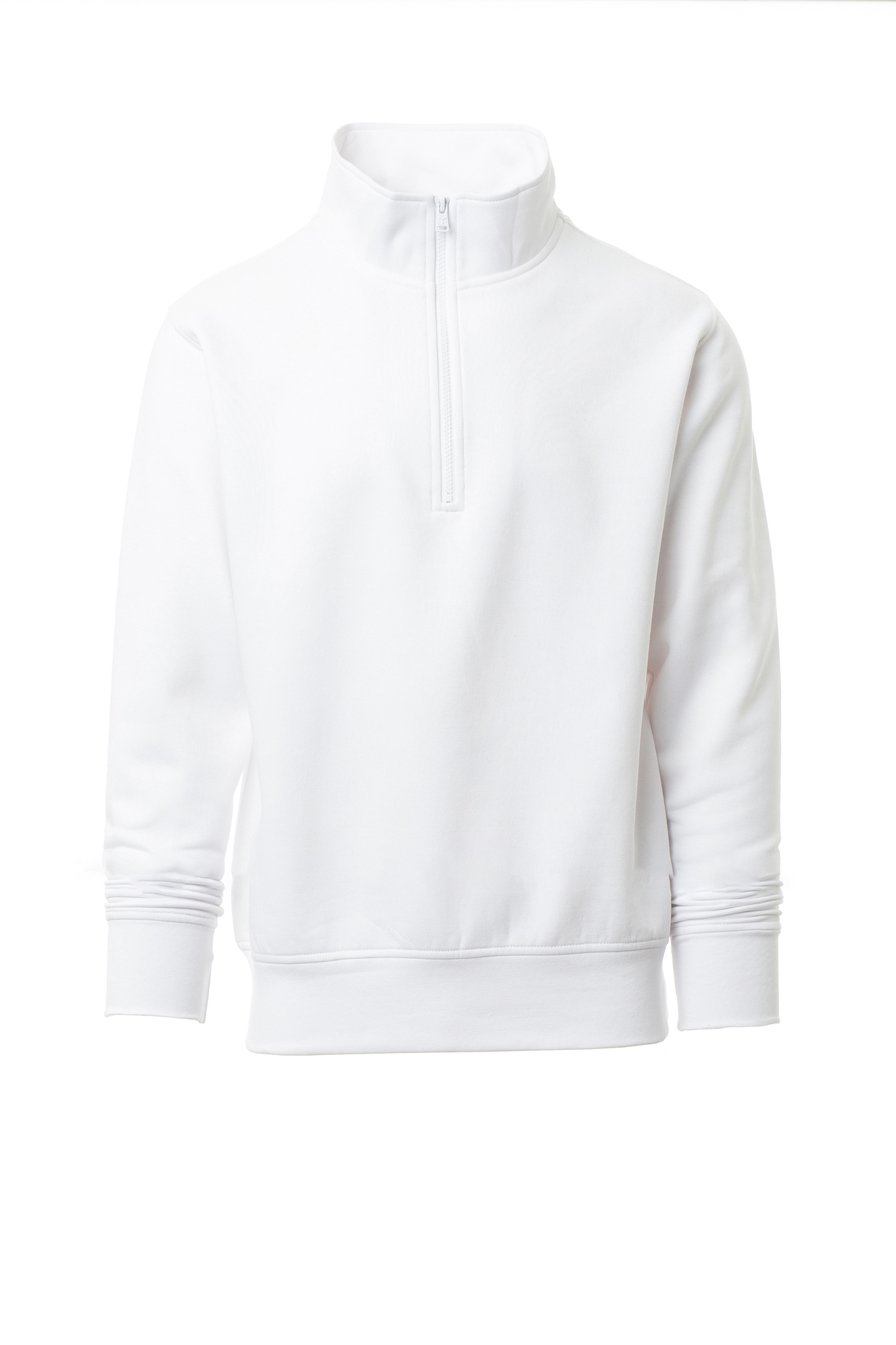 Felpa da uomo, mezza zip in tinta, in plastica con cursore in metallo, manica a giro, polsini e vita in costina elasticizzata, cuciture rinforzate.