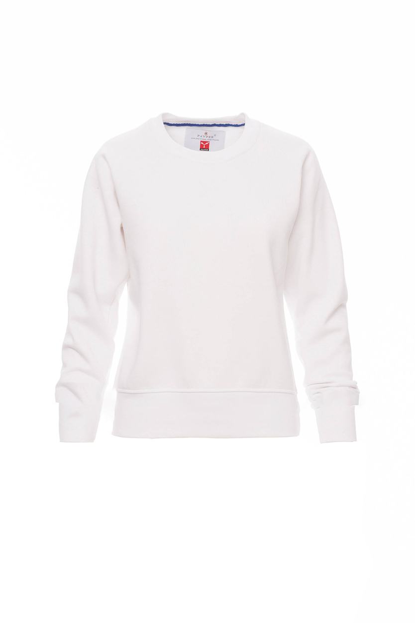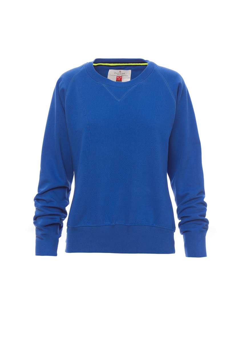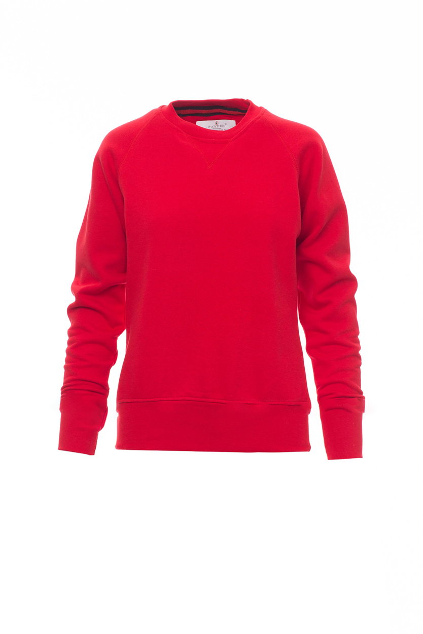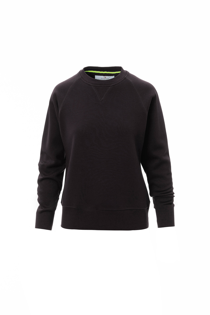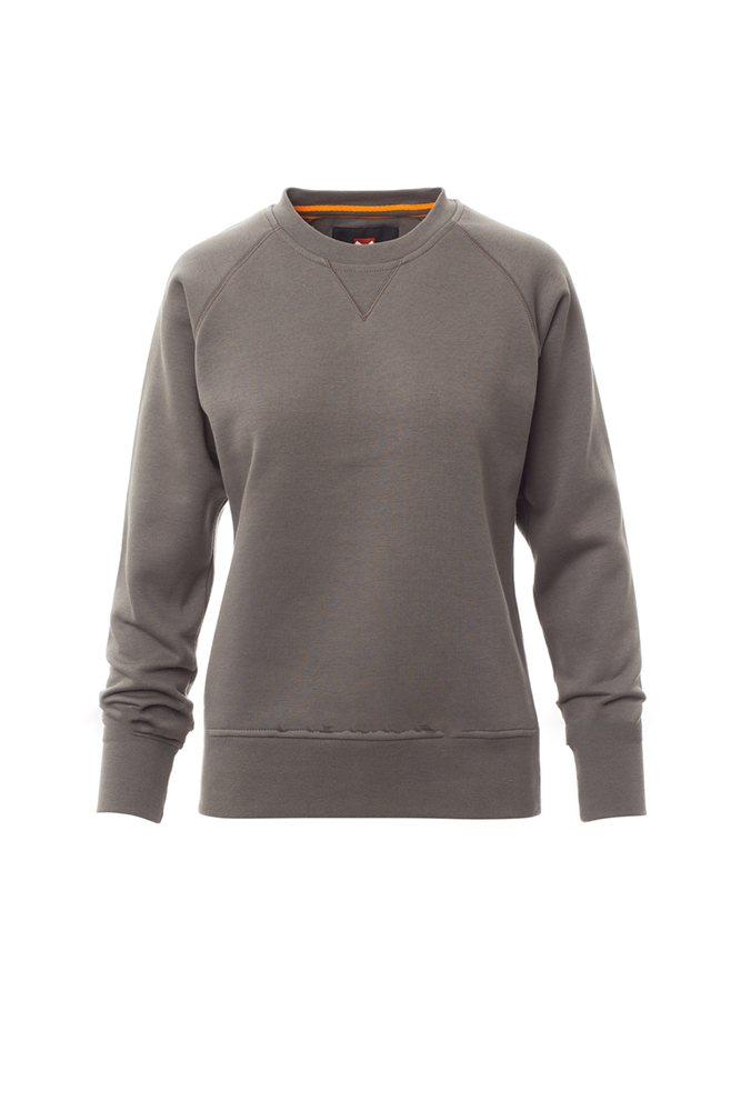 Felpa da donna girocollo, manica raglan, cucitura estetica a V al collo. Polsini e vita in costina elasticizzata, cuciture rinforzate.